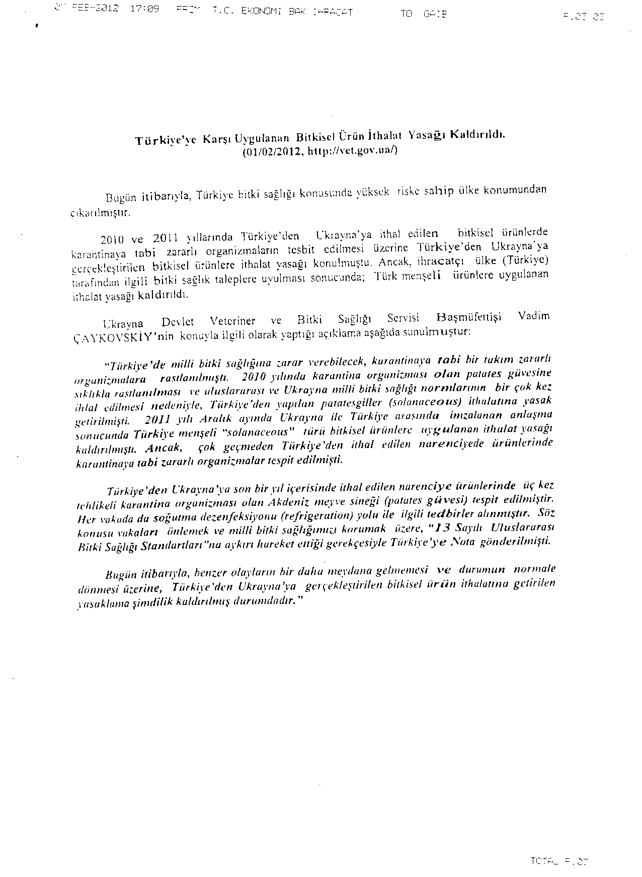 Ukrayna Devlet Veteriner ve Bitki Sağlığı Servisi’nin resmi internet sitesinde Türkiye’nin bitki sağlığı konusunda yüksek riske sahip ülke konumundan çıkarıldığına ilişkin yayımlanan haberin tercümesi ektedir.