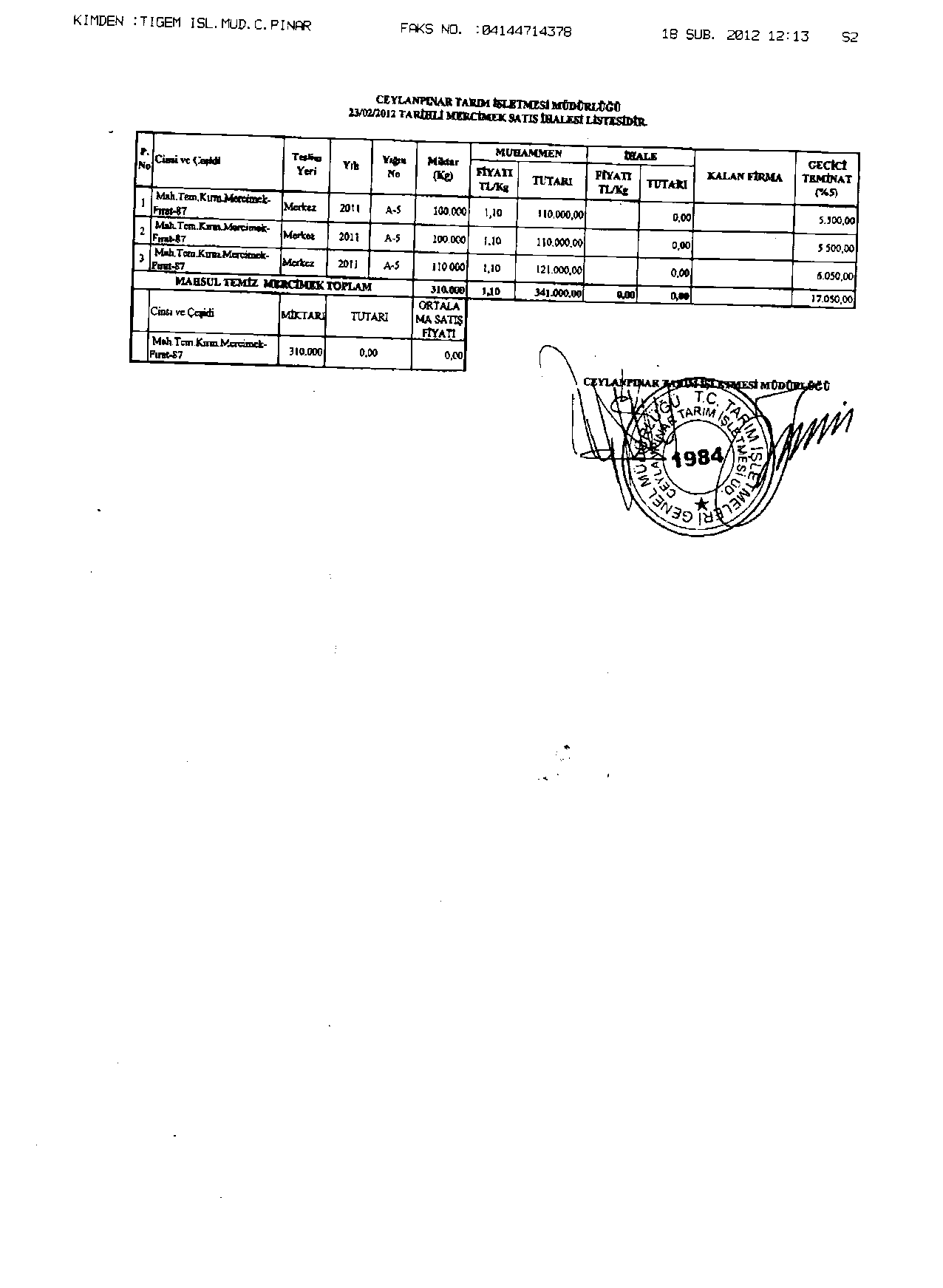 Tarım İşletmeleri Genel Müdürlüğü Ceylanpınar Tarım İşletmesi Müdürlüğü’nden alınan bir yazıda, Mahsul Temiz Kırmızı Mercimek- Fırat- 87 için satışında 310 Ton (1.2. ve 3. partiler) için 23.02.2012 tarihinde ihalenin tekrar yapılacağı bildirilmektedir.