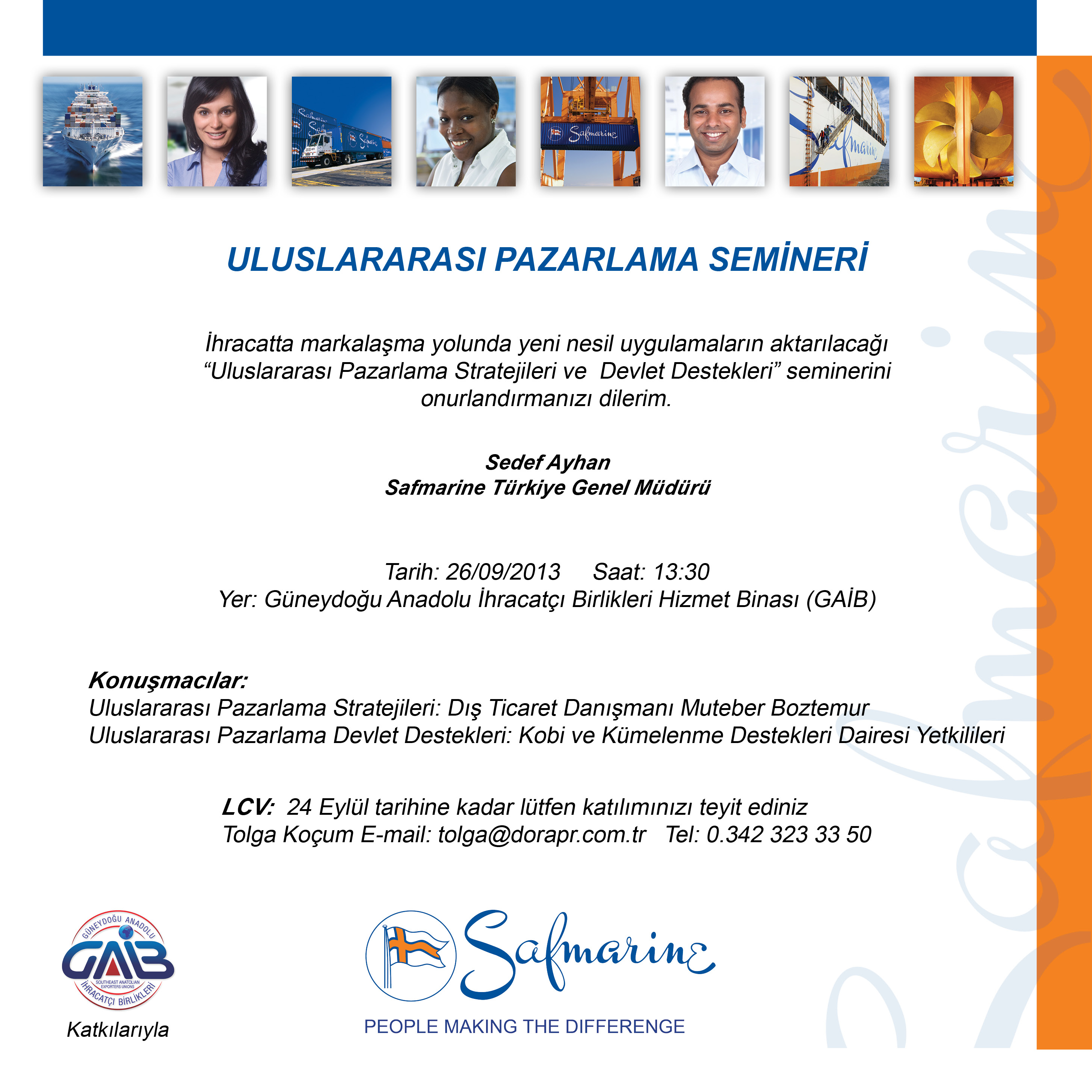 Güneydoğu Anadolu İhracatçı Birlikleri’nin (GAİB) ev sahipliğinde SAFMARINE TÜRKİYE tarafından, “Uluslararası Pazarlama Stratejileri ve İhracatta Markalaşma” semineri düzenlenecektir.