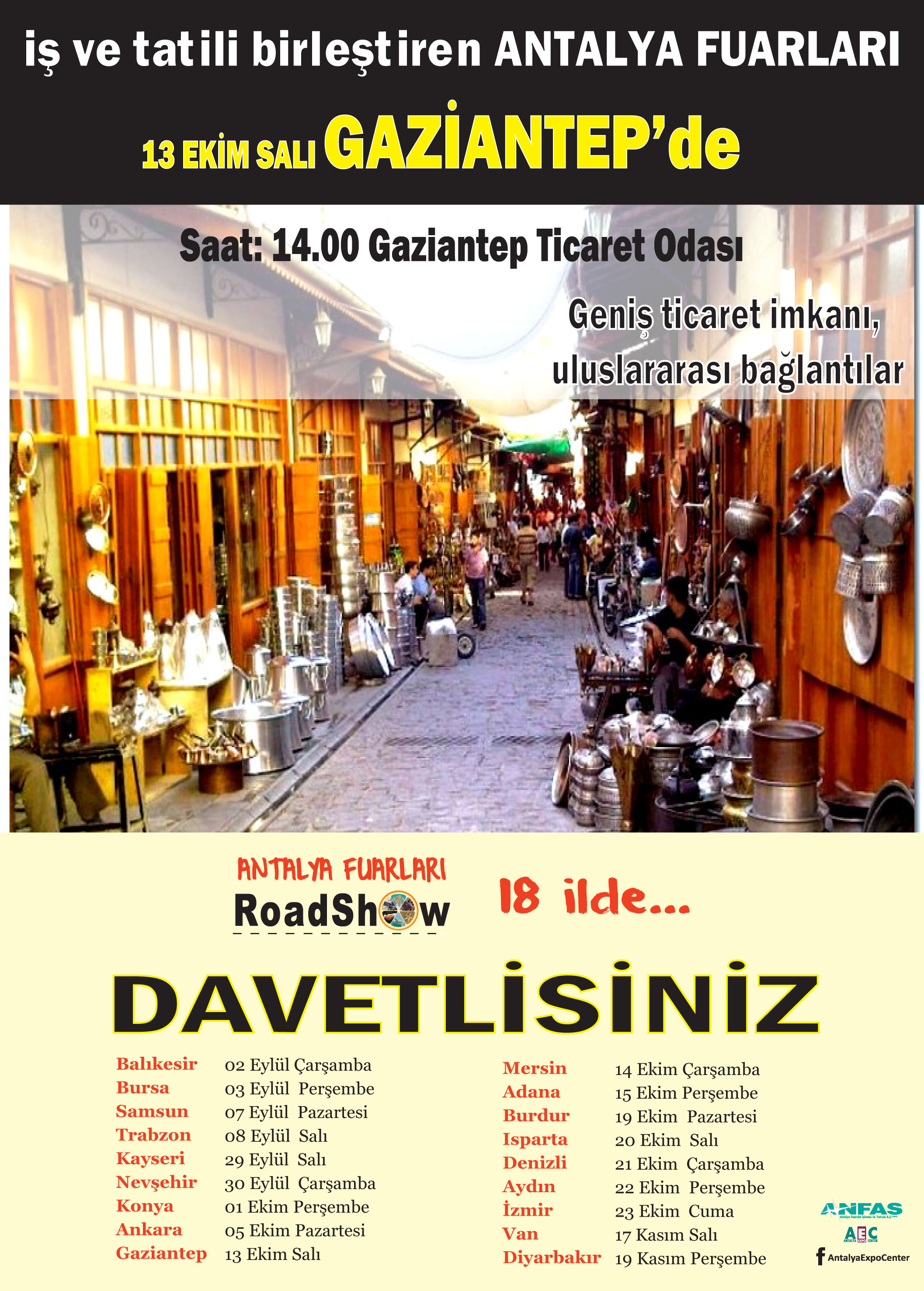 Batı Akdeniz İhracatçı Birlikleri’nden alınan yazıda; Birlikleri desteğiyle Antalya Fuarlarını tanıtmak amacıyla “Antalya Fuarları Roadshow” isimli bir çalışma yürütüldüğü ve ekte detayları yer alan söz konusu çalışma kapsamında 13 Ekim 2015 Salı günü saat 14:00’te Gaziantep Ticaret Odası’nda bir tanıtım toplantısı düzenleneceği bildirilmektedir.