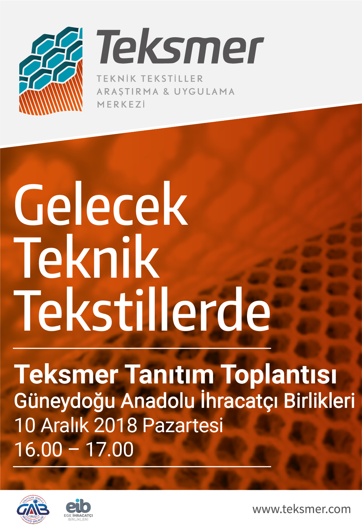 Ege Tekstil ve Hammaddeleri İhracatçıları Birliği, Ege Hazırgiyim ve Konfeksiyon İhracatçıları Birliği ve Dokuz Eylül Üniversitesi ortaklığı ile Türkiye’deki tekstil sektörünün teknik tekstiller alanında rekabet gücünün artırılmasına destek olmak amacıyla İzmir Kalkınma Ajansının desteği kapsamında kurulan TEKSMER A.Ş. (Teknik Tekstiller Araştırma ve Uygulama Merkezi)’nin tanıtımına yönelik olarak 10 Aralık 2018 Pazartesi günü saat 16.30’da Birliğimiz Hizmet Binasında bir bilgilendirme toplantısı yapılacaktır.