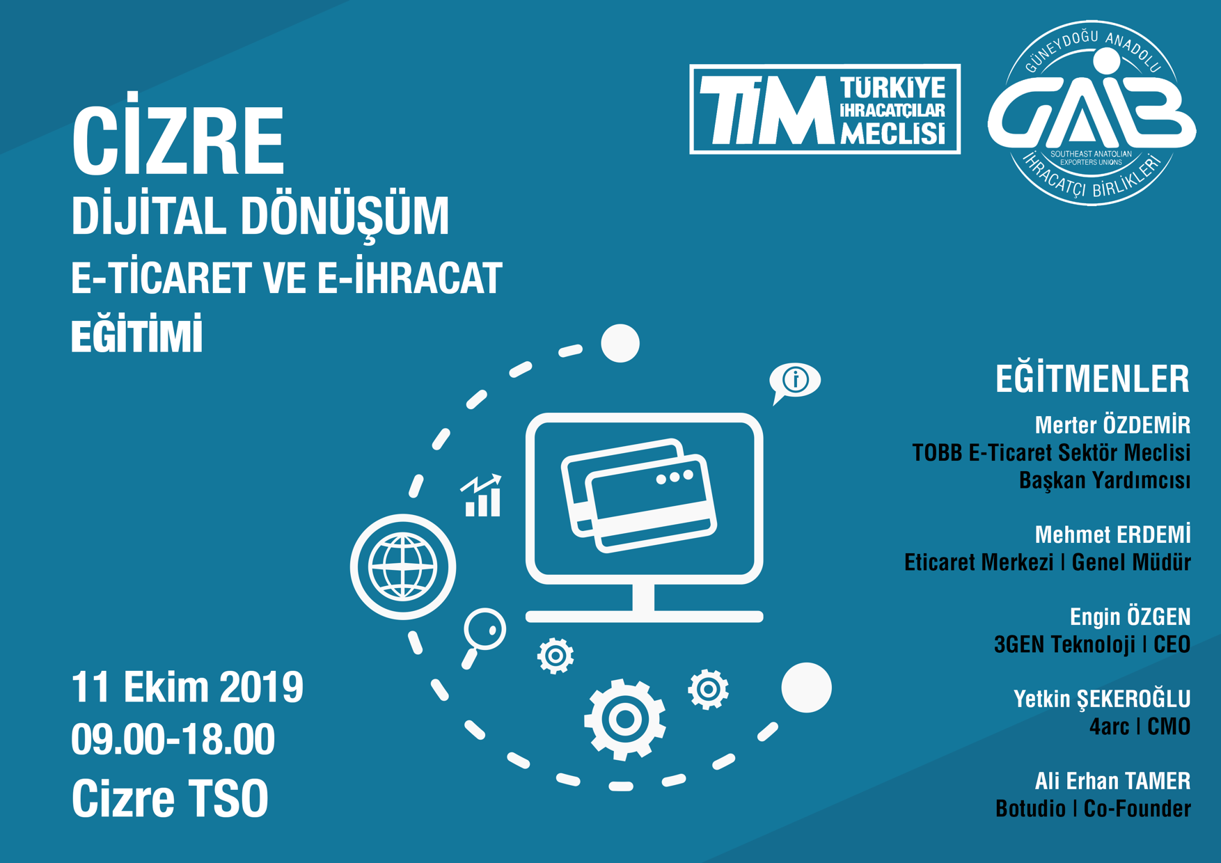 Güneydoğu Anadolu İhracatçı Birlikleri organizasyonu, Cizre Ticaret ve Sanayi Odası işbirliği ile;ilgililerine e-ihracat ve dijital dönüşüm hakkında bir vizyon kazanmaları, e-ticaret noktasında yol haritası oluşturabilmeleri ve yurtdışı pazaryerleri ile global bir ağ kurabilmeleri yönünde katkı sunmak amacıyla E-İhracat, E-Ticaret ve Dijital Dönüşüm Eğitimiverilecektir.