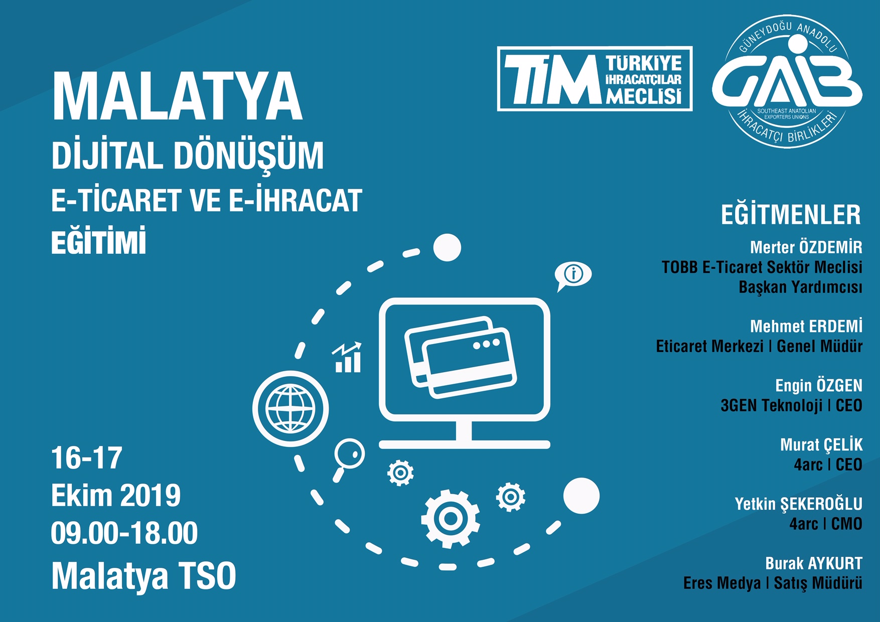 Güneydoğu Anadolu İhracatçı Birlikleri organizasyonu, Malatya Ticaret ve Sanayi Odası iş birliği ile;ilgililerine e-ihracat ve dijital dönüşüm hakkında bir vizyon kazanmaları, e-ticaret noktasında yol haritası oluşturabilmeleri ve yurtdışı pazaryerleri ile global bir ağ kurabilmeleri yönünde katkı sunmak amacıyla 16-17 Ekim 2019tarihlerinde Malatya Ticaret ve Sanayi Odası Merkez Binasında 2 günlük bir E-İhracat, E-Ticaret ve Dijital Dönüşüm Eğitimi verilecektir.