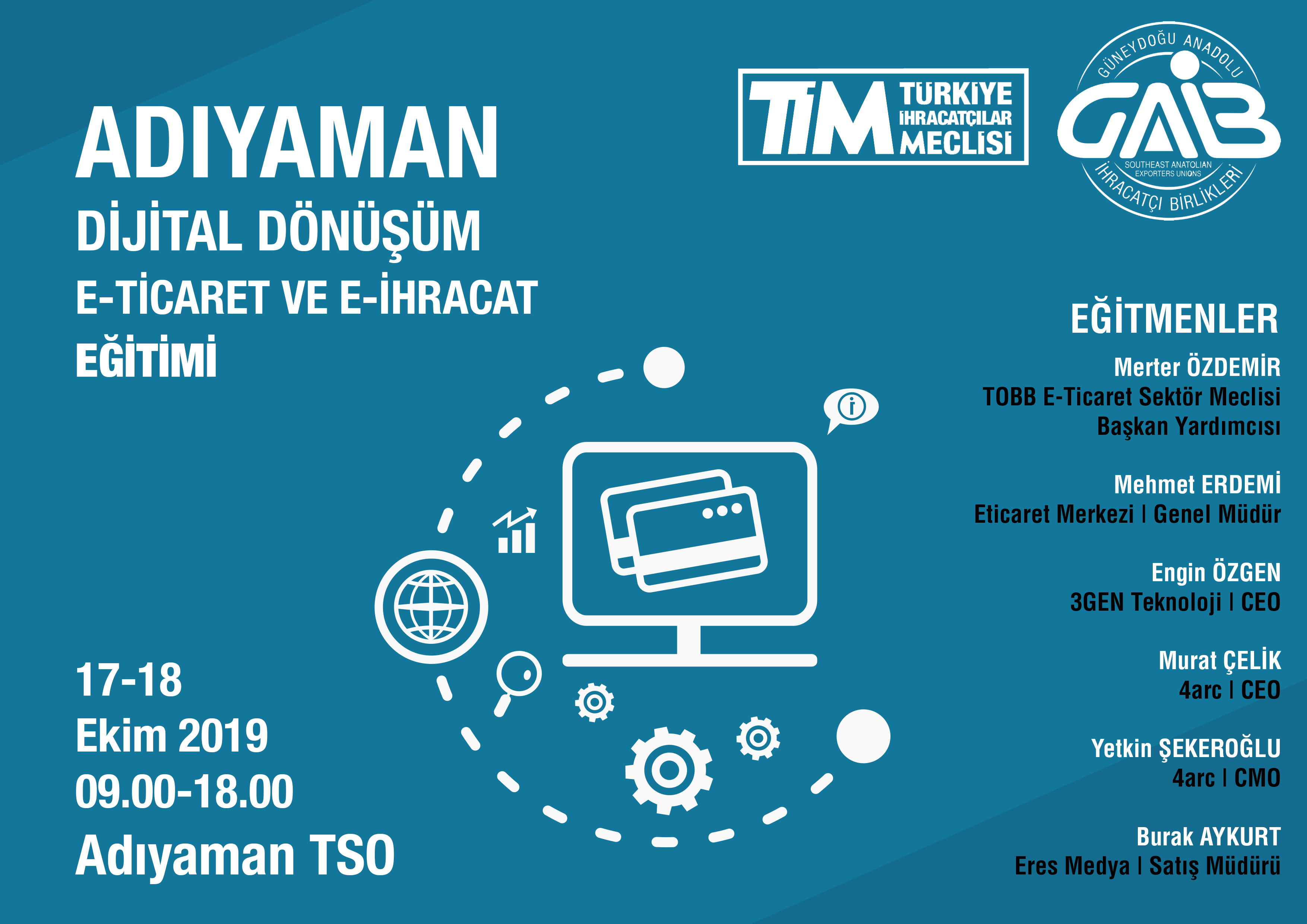 Güneydoğu Anadolu İhracatçı Birlikleri organizasyonu, Adıyaman Ticaret ve Sanayi Odası işbirliği ile;ilgililerine e-ihracat ve dijital dönüşüm hakkında bir vizyon kazanmaları, e-ticaret noktasında yol haritası oluşturabilmeleri ve yurtdışı pazaryerleri ile global bir ağ kurabilmeleri yönünde katkı sunmak amacıyla 2 günlük bir “E-İhracat, E-Ticaret ve Dijital Dönüşüm Eğitimi”verilecektir.