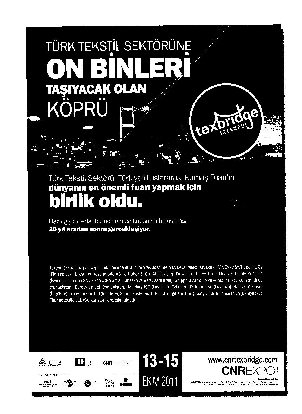 Uludağ İhracatçı Birlikleri Genel Sekreterliği’nden alınan bir yazıda, İstanbul Fuarcılık organizasyonu ve UİB desteği ile 13–15 Ekim 2011 tarihleri arasında CNR Expo/İstanbul’da Texbridge Fuarı gerçekleştirileceği bildirilmekte ve fuara ilişkin duyuru ekte sunulmaktadır.