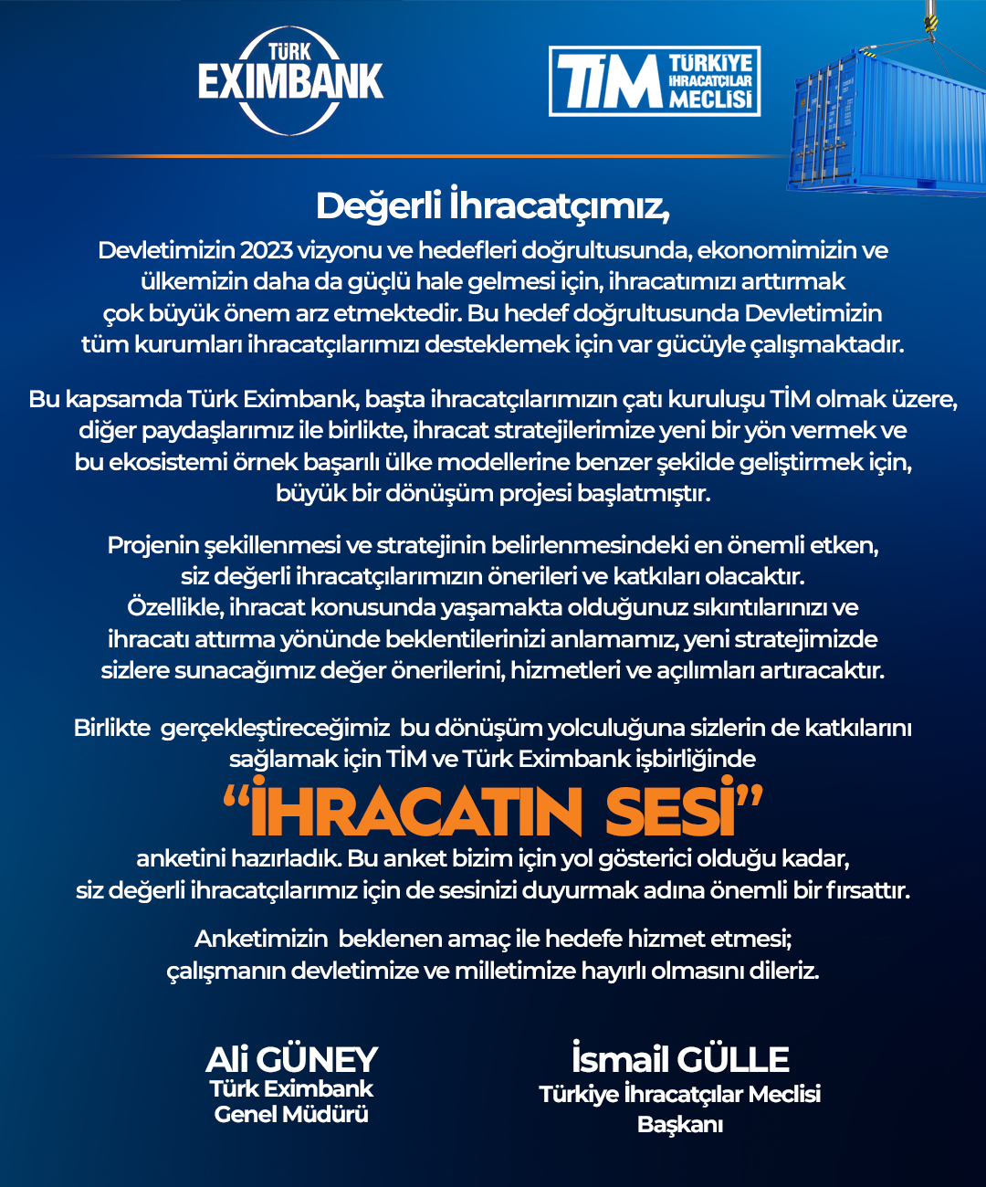 TİM’den alına bir yazıda, daha önce ihracat konusunda yaşanılan sıkıntılar ve ihracatı arttırma yönündeki beklentilerin belirlenmesi ve yeni ihracat stratejilerinin ortaya konulmasında belirleyici olacak TİM ve Türk Eximbank işbirliğindeki “İhracatçının Sesi” anketinin hazırlandığının duyurulduğu, ihracat konusunda yaşanılan sıkıntılar ve ihracatı arttırma yönündeki beklentilerin belirlenmesi, yeni stratejilerin hizmete sunulmasında bahse konu anketin doldurulmasının önem arz ettiğinin aktarıldığı ifade edilmektedir.