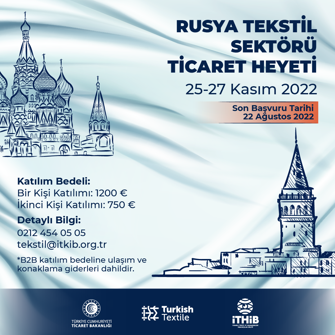 İstanbul Tekstil ve Konfeksiyon İhracatçı Birlikleri Genel Sekreterliği’nden alınan bir yazıda, İstanbul Tekstil ve Hammaddeleri İhracatçıları Birliği (İTHİB) tarafından, katma değerli ihracat hedeflerine ulaşılabilmesi ve küresel ihracattan daha fazla pay alınabilmesini teminen ticaret ve alım heyetleri organize edilmekte olup, bu kapsamda, 2021 yılında gerçekleştirdiği 4,8 milyar USD değerindeki ithalatla dünya tekstil ve hammaddeleri ithalatında önemli bir konuma sahip olan Rusya Federasyonu değerlendirilmiş ve bahse konu ülke özelinde bir ticaret heyetinin gerçekleştirilmesine karar verildiği bildirilmiştir.