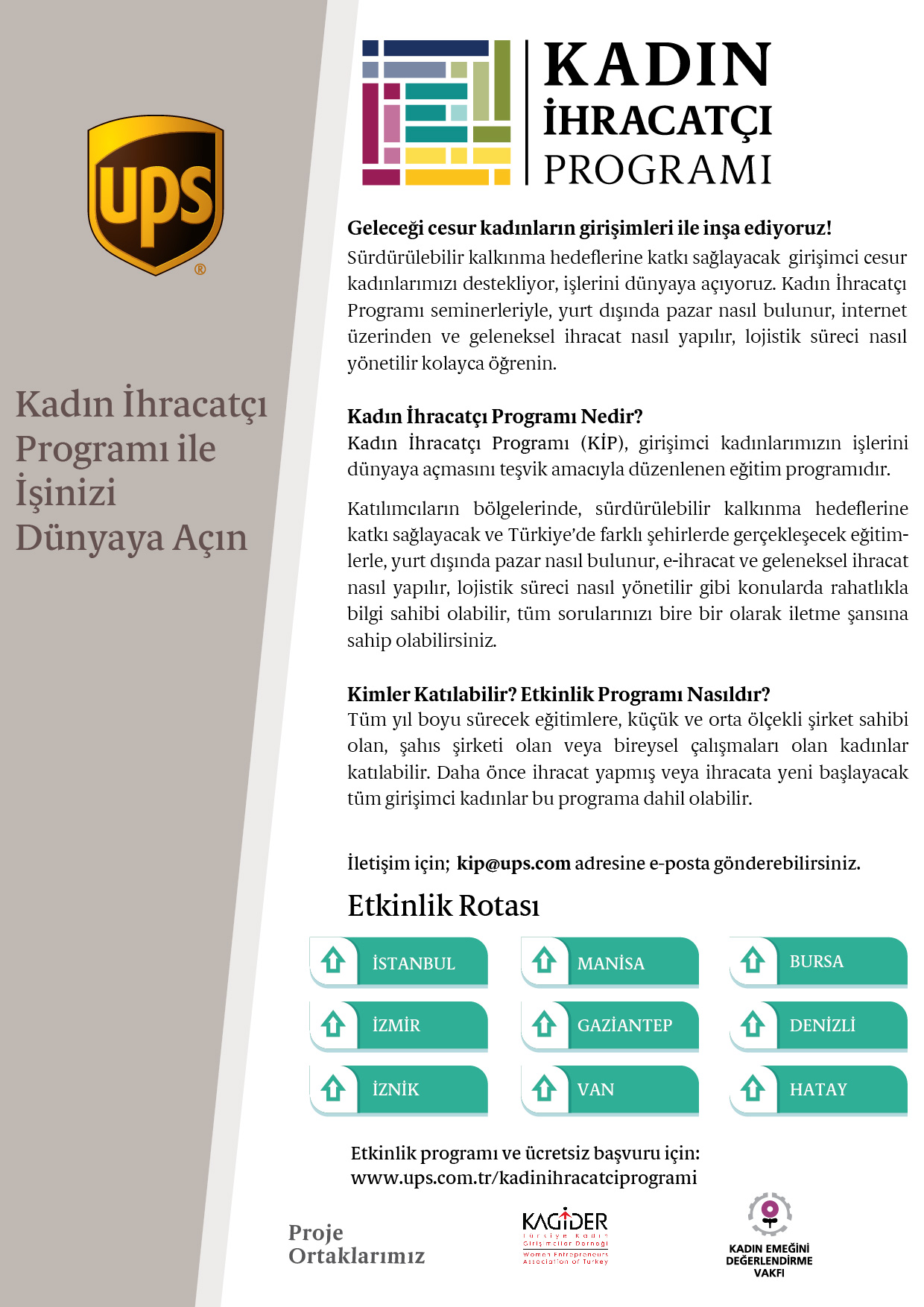 UPS Hızlı Kargo Taşımacılığı AŞ. ’den alınan bir yazıda, UPS’nin, dünyanın 220’den fazla ülke ve bölgesinde 450,000’den fazla çalışanı ile günde 20 milyondan fazla paket taşıyan uluslararası hızlı kargo şirketi olduğu belirtilmiş olup, uluslararası hizmete başladığı ilk yıllardan itibaren dünya ticaretinin gelişmesi için çabalar harcamış ve bu alanda çeşitli programları desteklemiş olduğu ifade edilmektedir. Bu programlardan en yenisinin kadınları dünya ticaretinin önemli bir parçası haline getirmek için Dünya Ticaret Örgütü bağlantılı Uluslararası Ticaret Merkezi ile birlikte tasarlanan UPS Kadın İhracatçı Programı (KİP) olduğu belirtilmektedir.