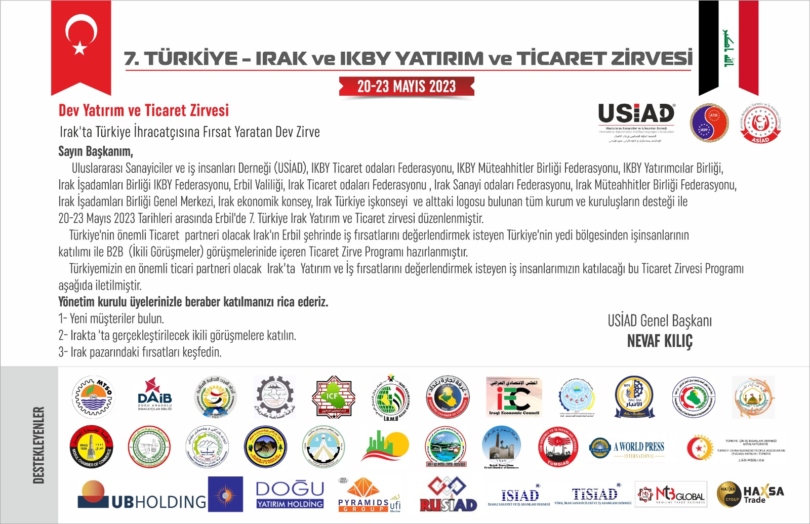 Uluslararası Sanayiciler ve İş Adamları Derneği’nden (USİAD) alınan elektronik bir iletide, 20-23 Mayıs 2023 tarihleri arasında Erbil'de 7. Türkiye Irak Yatırım ve Ticaret zirvesi düzenleneceği belirtilmektedir.