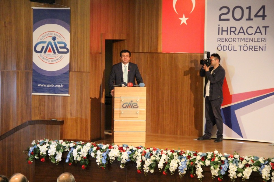 Güneydoğu Anadolu İhracatçı Birlikleri’nin (GAİB) ev sahipliğinde düzenlenen 2014 İhracat Rekortmenleri Ödül Töreni’nde, Güneydoğu’daki sanayici ve işadamlarına övgüler yağdıran Ekonomi Bakanı Zeybekçi ‘’Durmak Yok, İhracata devam. Gaziantep’in 25 milyar dolar hedefine ulaşacağından eminim. Türkiye olarak hedefimiz, 500 milyar dolar” dedi. Bakan Zeybekçi, konuşmasında ileri teknoloji yatırımları yapanlara özel destek sunduklarının da altını çizdi. Yapılan konuşmalarda Habur’a açılması düşünülen ikinci sınır kapısı ve yaşanan sorunlar da dile getirildi. Ekonomi Bakanı Nihat Zeybekçi, Gaziantep’in ve Güneydoğu’nun ihracat rakamları açısından 10 kat büyüme gösterdiğini belirterek ‘’2002 yılında 620 milyon TL olan ihracat rakamı bugün 6,7 Milyar dolara yükseldi. Güneydoğu’nun tamamında ise bu rakam 11 Milyar dolar. 25 Milyar dolar bu artışlar göz önüne alındığında bölge için büyük bir hedef değil. Ben Gaziantep’in ve Güneydoğu’nun 25 Milyar Doların üzerinde bir ihracat yapacağını biliyorum’’ dedi.