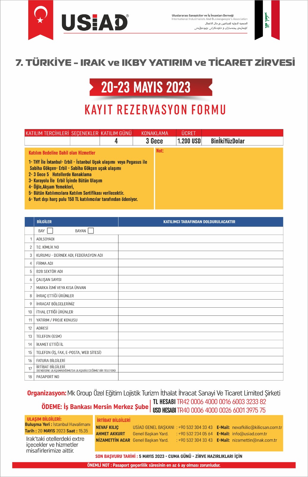 Uluslararası Sanayiciler ve İş Adamları Derneği’nden (USİAD) alınan elektronik bir iletide, 20-23 Mayıs 2023 tarihleri arasında Erbil'de 7. Türkiye Irak Yatırım ve Ticaret zirvesi düzenleneceği belirtilmektedir.