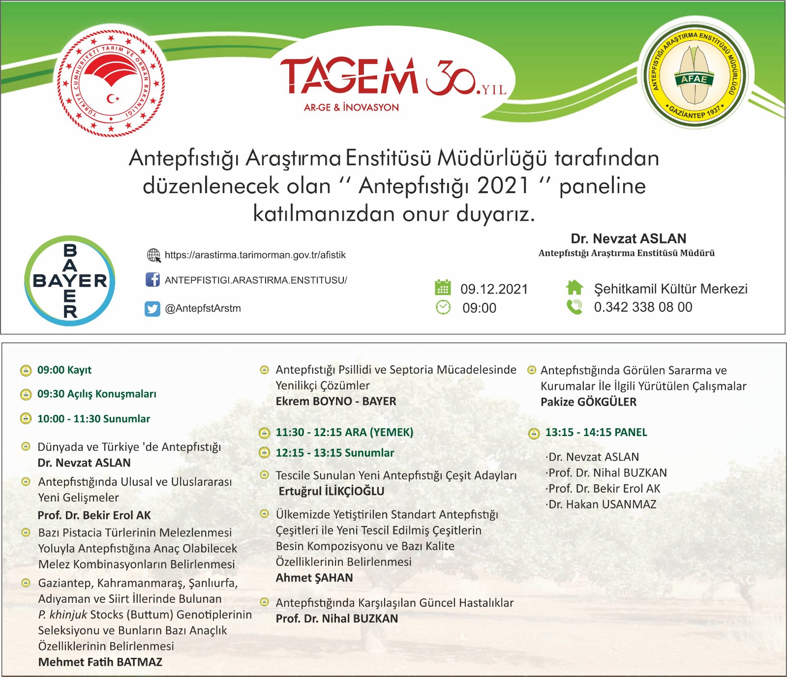 T.C. Tarım ve Orman Bakanlığı’ndan alınan bir yazıda, Tarımsal Araştırmalar ve Politikalar Genel Müdürlüğü Gaziantep Antepfıstığı Araştırma Enstitüsü Müdürlüğü tarafından 9 Aralık 2021 tarihinde, ekte programı bildirilen “Antepfıstığı 2021” panelinin Gaziantep’te Şehitkamil Kongre Merkezinde gerçekleştirileceği bildirilmektedir. Söz konusu etkinliğe ait davetiye ekte yer almaktadır.