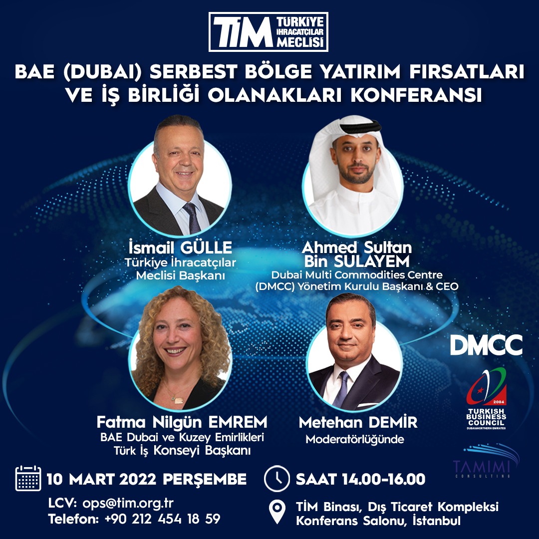 Türkiye İhracatçılar Meclisi’nden (TİM) alınan bir elektronik iletide, 10 Mart 2022 Perşembe saat 14.00'te TİM Binası Dış Ticaret Kompleksi Konferans Salonu'nda; Dubai Multi Commodities Centre (DMCC) Yönetim Kurulu Başkanı & CEO Ahmed Sultan Bin Sulayem'in katılımıyla “BAE (Dubai) Serbest Bölge Yatırım Fırsatları ve İş Birliği Olanakları Konferansı” gerçekleştirileceği bildirilmiştir.