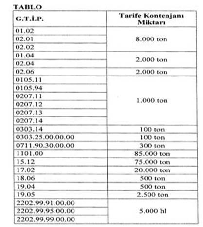 Buna göre Bosna Hersek menşeli; Canlı Büyükbaş Hayvanlar, Büyükbaş Hayvanların Taze ve Dondurulmuş Etleri, Canlı Koyun ve Keçiler, Koyun ve Keçilerin Dondurulmuş Etleri, Canlı Horoz ve Tavuklar, Horoz ve Tavukların Parçalanmış ve Parçalanmamış Etleri, Sakatatları, Dondurulmuş ve Soğutulmuş Olanlar Sazan Balığı, Geçici Olarak Konserve Edilmiş Sebze Karışımları, Buğday Unu ve Mahlut, Ayçiçeği Tohumu, Aspir veya Pamuk Tohumu Yağları, Şeker, Çikolata ve Kakao İçeren Diğer Gıda Müstahzarları, Hububat veya Hububat Ürünleri Ekmek, Pasta, Kek, Bisküvi ve Diğer Ekmekçilik Mamulleri ve Bira ürünlerinde Tarife Kontenjanı uygulanacağı ifade edilmektedir.
