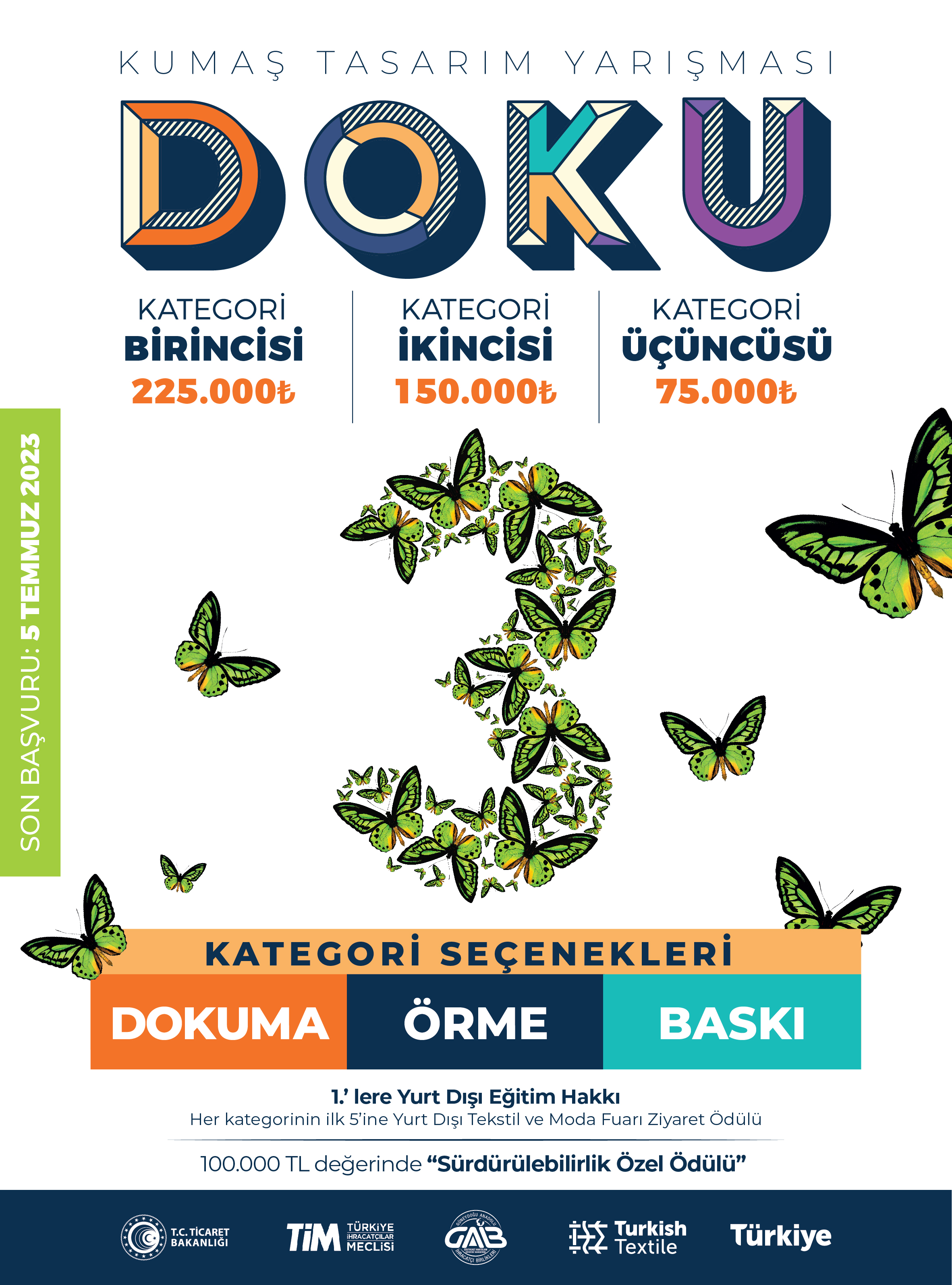 Dokuma kumaş, örme kumaş ve baskı kumaş olmak üzere 3 ayrı kategoride düzenlenen Doku Kumaş Tasarım Yarışması için son başvuru tarihi 5 Temmuz 2023 olup, yarışma afişi ekte yer almaktadır. Yarışmaya ilişkin detaylı bilgi ve başvuru için aşağıdaki bağlantılardan faydalanılabilir.