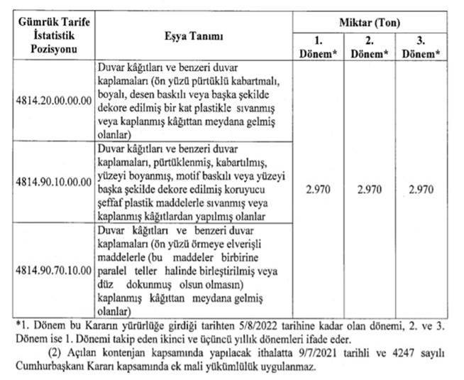 20.08.2021 tarihli Resmî Gazete'de yayımlanan 4393 sayılı Cumhurbaşkanı Kararı ile Duvar Kâğıdı ve Benzeri Duvar Kaplamaları İthalatında Tarife Kontenjanı Uygulanması Hakkında Karar yürürlüğe konulmuştur. Karar, 4247 sayılı Cumhurbaşkanı Kararı ile yürürlüğe konulan Duvar Kâğıdı ve Benzeri Duvar Kaplamaları İthalatında Korunma Önlemi Uygulanmasına İlişkin Karar kapsamında uygulanan ek mali yükümlülükten muafiyet sağlamak üzere yürürlüğe konulmuştur.