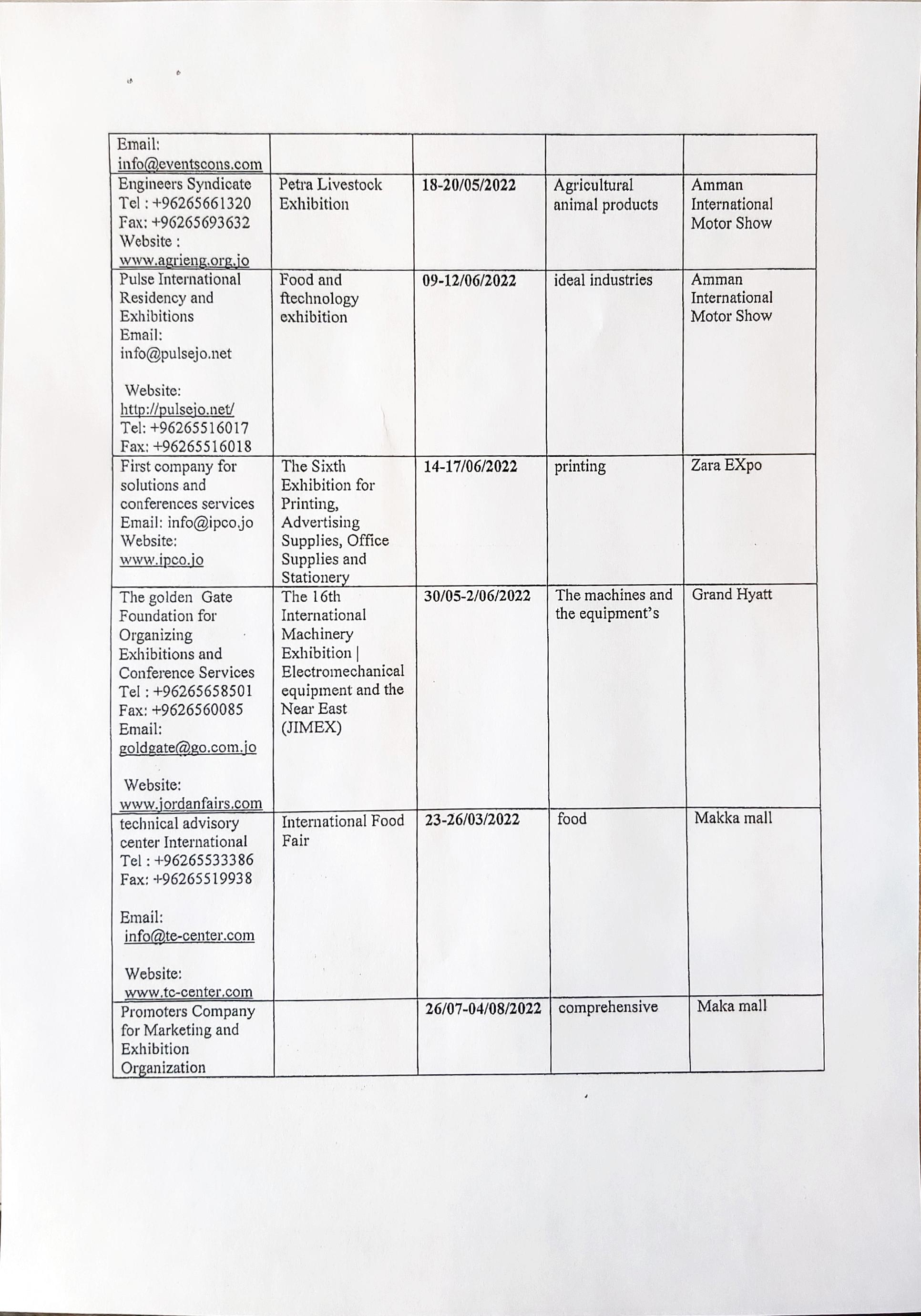 T.C. Ticaret Bakanlığından alınan bir yazıda Ürdün'ün Ankara Büyükelçiliği'nden alınan Nota'ya atfen, Ürdün Yatırım Bakanlığı'nın 2022 yılı içerisinde çeşitli alanlarda fuarlar düzenleyeceği bildirilmektedir.