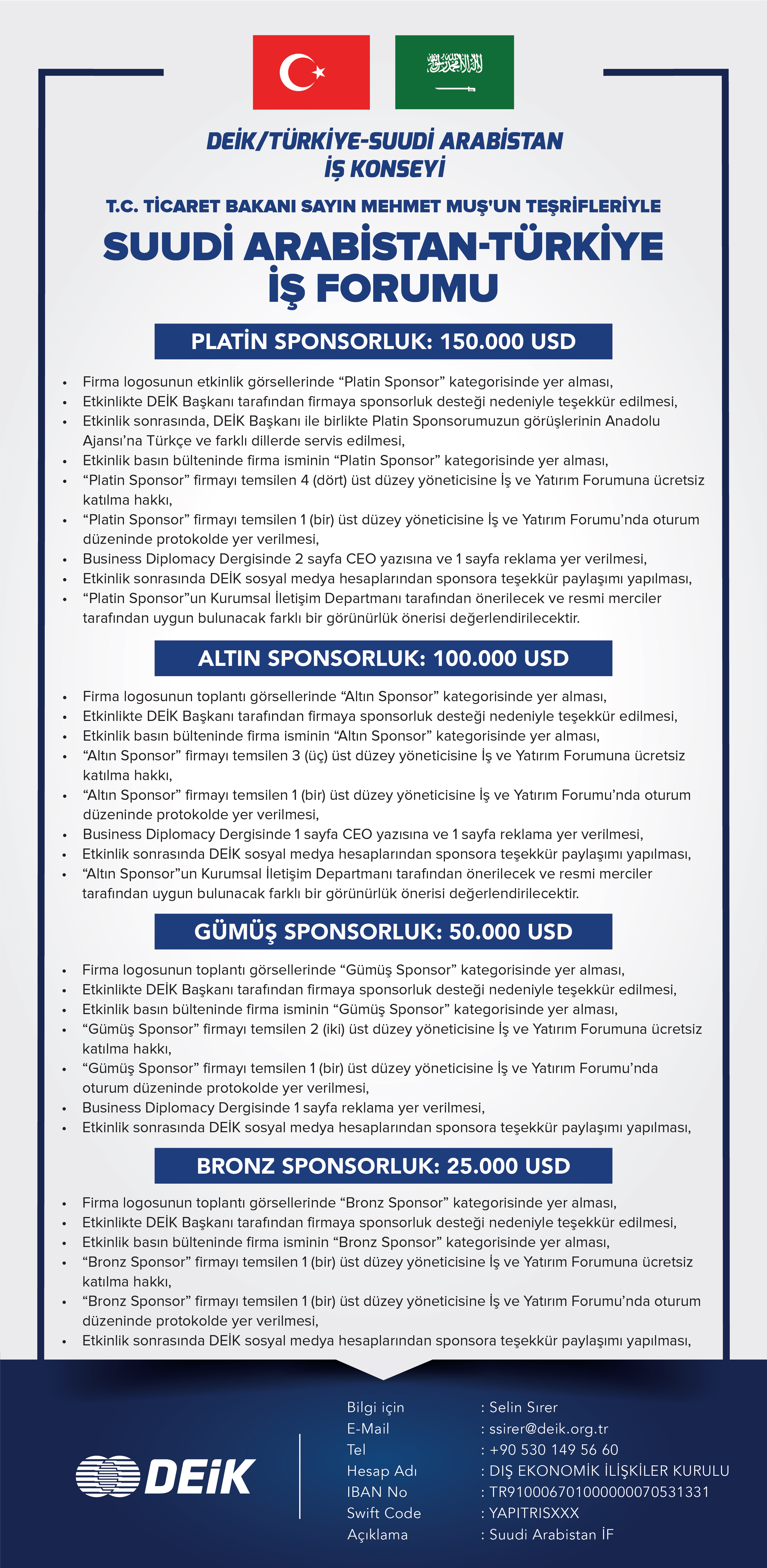 Dış Ekonomik İlişkiler Kurulundan (DEİK) alınan bir yazıda, T.C. Ticaret Bakanımız Sayın Mehmet Mus’un 18-20 Mart 2023 tarihlerinde Suudi Arabistan’ı resmi ziyareti kapsamında, 19 Mart 2023 Pazar günü Riyad’da DEİK ve Suudi Arabistan Ticaret Odaları Federasyonu (FSC) koordinasyonunda “Suudi Arabistan-Türkiye İş Forumu” gerçekleştirileceği belirtilmiştir.