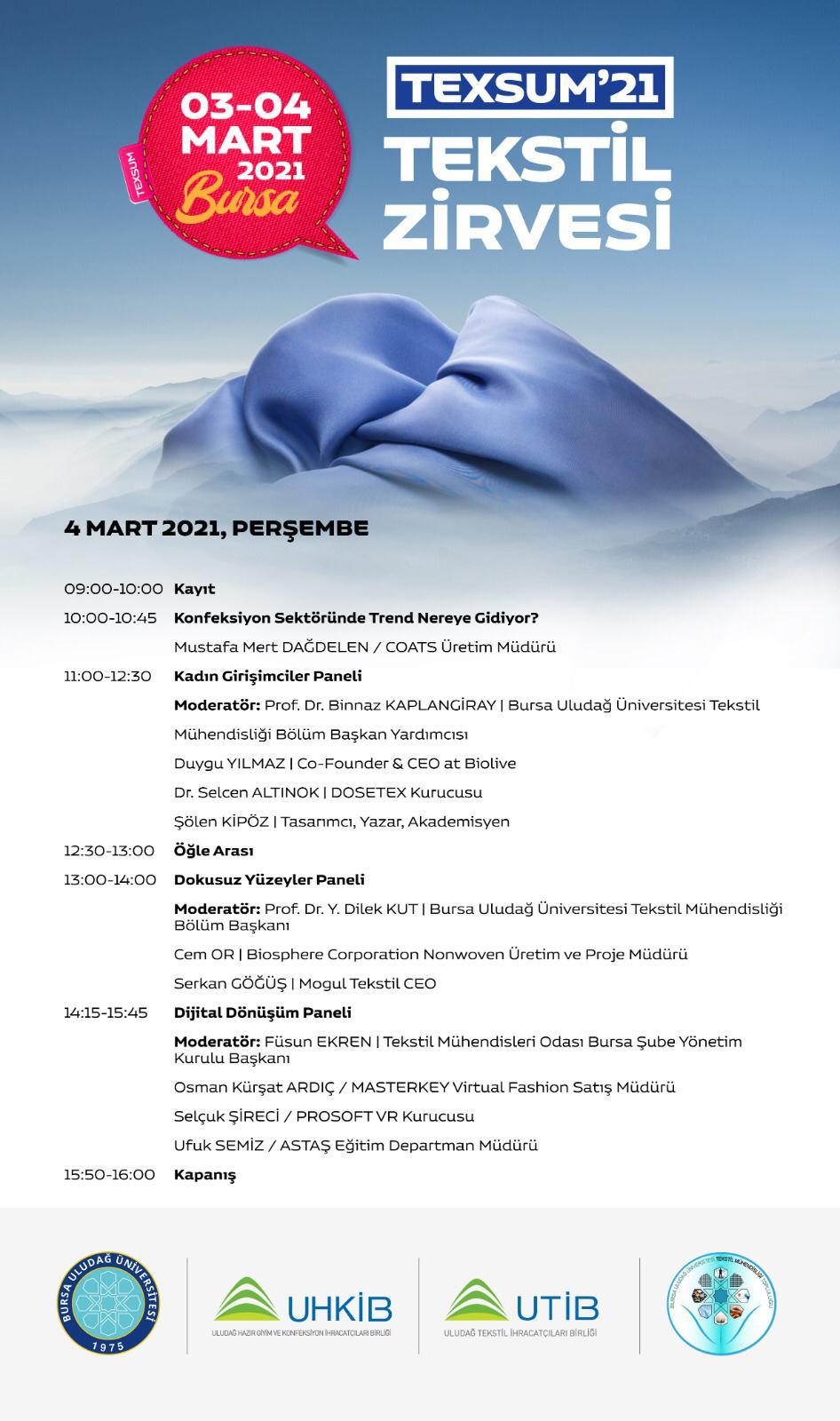 Uludağ İhracatçı Birliklerinden alınan bilgiye göre, Bursa Uludağ Üniversitesi Tekstil Mühendisliği Bölümü ve Topluluğu, Uludağ Tekstil İhracatçıları Birliği ve Uludağ Hazır Giyim ve Konfeksiyon İhracatçıları Birliği işbirliğinde tekstil mühendisliği öğrencilerinin geleceklerine yön verebilmek, kariyer hedeflerine yönelik fikir sahibi olmalarını sağlamak, sektörle ilgili soru işaretlerine yanıt bulabilmek amacıyla Birlik Başkanlarının da teşrifleri ile online olarak (zoom webinar) bir etkinlik düzenlenecektir. Söz konusu etkinliğin programı ekte sunulmaktadır.