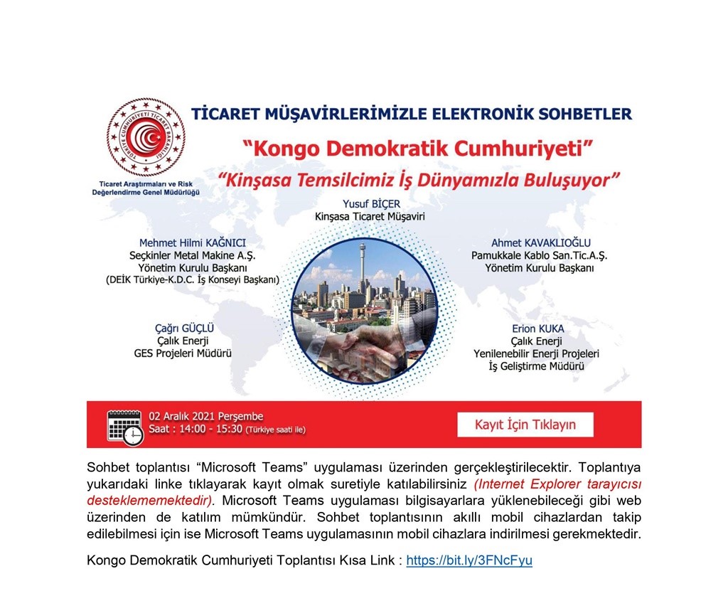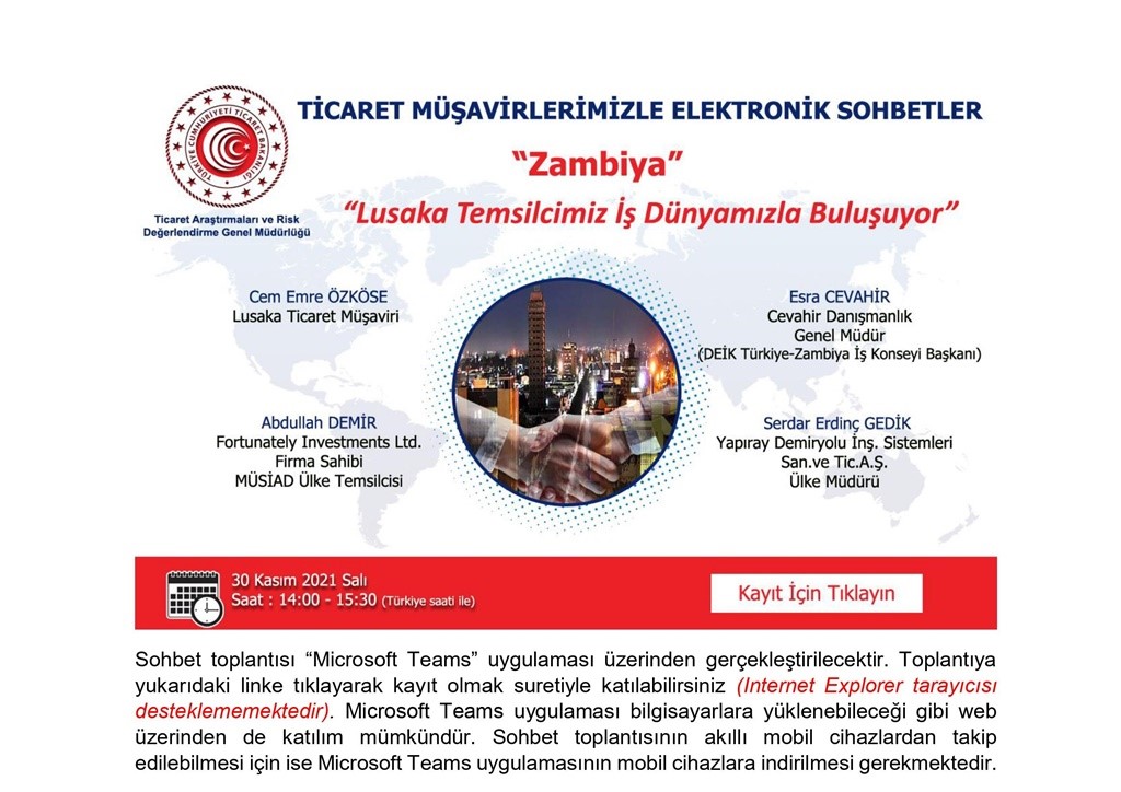 Türkiye İhracatçılar Meclisi’nden (TİM) alınan bir yazıda, Ticaret Müşavir ve Ataşelerimizle Türk İş Dünyasını bir araya getirmek üzere Ticaret Bakanlığı tarafından “Ticaret Müşavirlerimizle Elektronik Sohbetler” toplantılarının düzenlenmekte olduğundan bahisle; 30 Kasım 2021 Salı günü 14:00-15:30 saatleri arasında Zambiya’da görev yapmakta olan Ticaret Müşavirimiz ve 2 Aralık 2021 Perşembe günü 14:00- 15:30 saatleri arasında Kongo Demokratik Cumhuriyeti’nde görev yapmakta olan Ticaret Müşavirimiz ile bu ülkede görev yapmakta olan iş insanlarımızın konuşmacı olarak katılarak tecrübelerini paylaşacağı bir e-sohbet toplantısının gerçekleştirileceği belirtilmektedir.