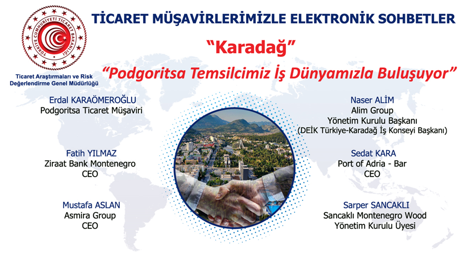 T.C. Ticaret Bakanlığı tarafından düzenlenmekte olan “Ticaret Müşavirlerimizle Elektronik Sohbetler-Karadağ” e-sohbet etkinliği 02 Kasım 2021 Salı günü 14.00-15.30 saatleri arasında gerçekleştirilecektir.