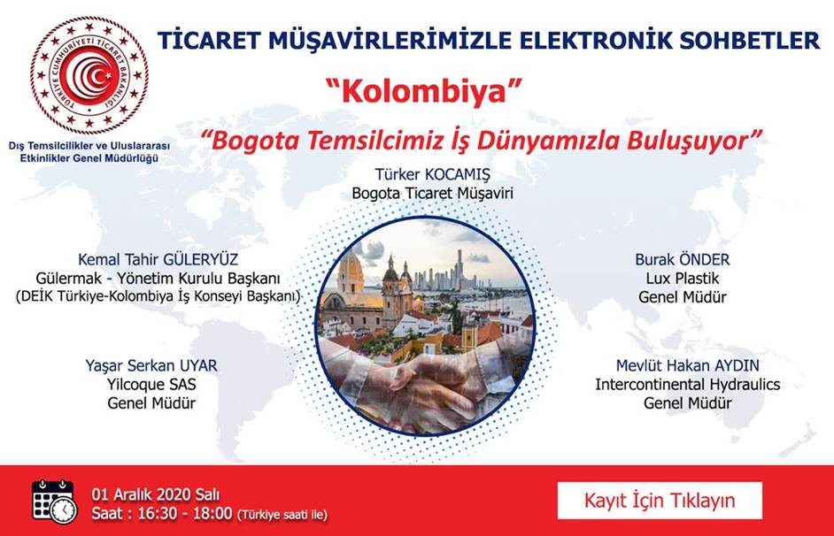 Ticaret Bakanlığı’ndan alınan bir elektronik iletide, Ticaret Bakanlığı tarafından düzenlenmekte olan “Ticaret Müşavirlerimizle Elektronik Sohbetler-Kolombiya” e-sohbet etkinliğinin 1 Aralık 2020 Salı günü 16.30-18.00 saatleri arasında gerçekleştirileceği bildirilmektedir.