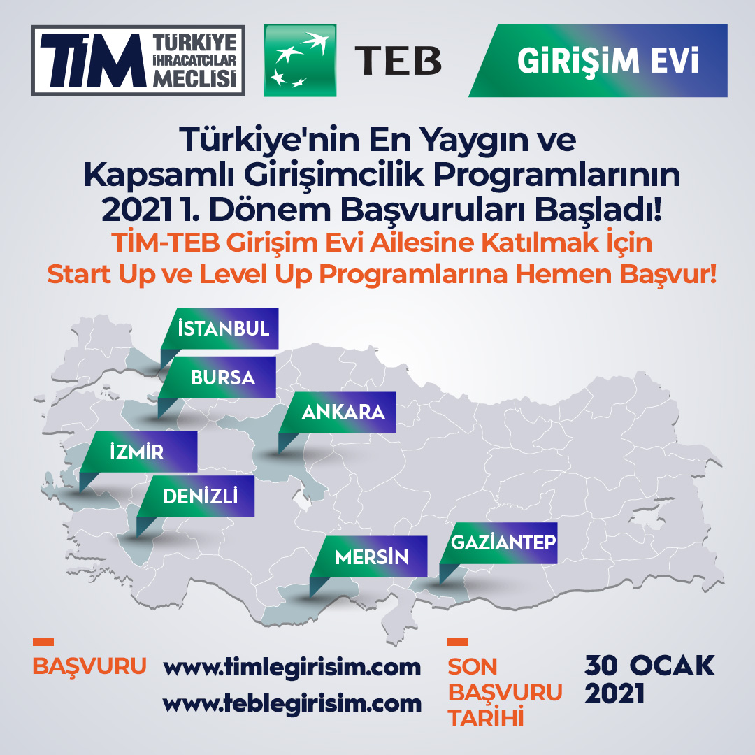 Türkiye İhracatçılar Meclisi’nden (TİM) alınan bir yazıda, Türkiye İhracatçılar Meclisi Genel Sekreterliğinden alınan bir yazıda; TİM-TEB Girişim Evleri'nin, teknoloji girişimcilerinin ve teknoloji şirketlerinin sürdürülebilirliğini ve hızla büyümesini sağlamaya yönelik inkübasyon, hızlandırma ve büyüme aşamalarındaki özgün programları ile ekosisteme yön verdiği belirtilmekte olup TİM TEB Girişim Evlerinde,