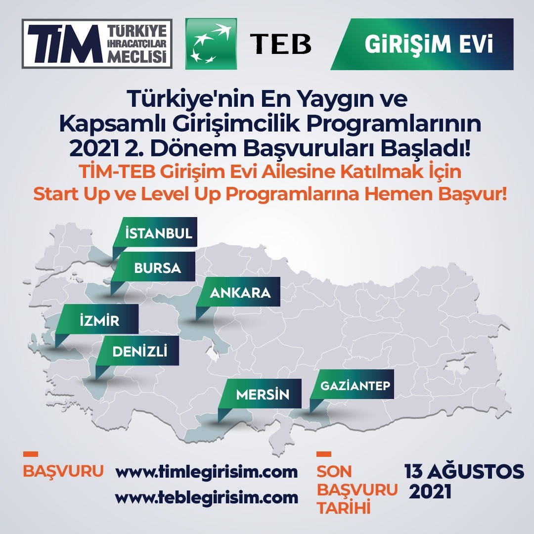 Türkiye İhracatçılar Meclisi’nden (TİM) alınan bir yazıda, katma değerli ihracatımızın artırılması amacıyla Ar-Ge, inovasyon, girişimcilik, tasarım ve markalaşma çalışmalarına odaklanan Türkiye İhracatçılar Meclisi tarafından, 2015 yılından bu yana Türk Ekonomi Bankası ortaklığıyla yürütülen TİM-TEB Girişim Evleri bünyesinde, 2021 yılı ilk yarısında İstanbul, Ankara, İzmir, Denizli, Gaziantep, Bursa ve Mersin’de TİM-TEB Girişim Evi, Trabzon ve Erzurum’da TİM Girişim Evi olarak 9 farklı ilde muhtelif çalışmalara devam edildiği bugüne kadar 1.300’e yakın teknoloji odaklı girişimciye destek verildiği bildirilmektedir.