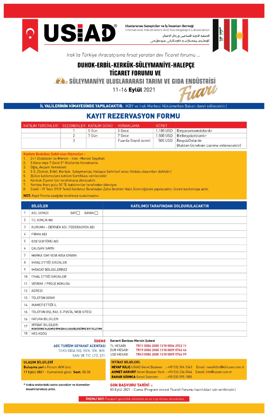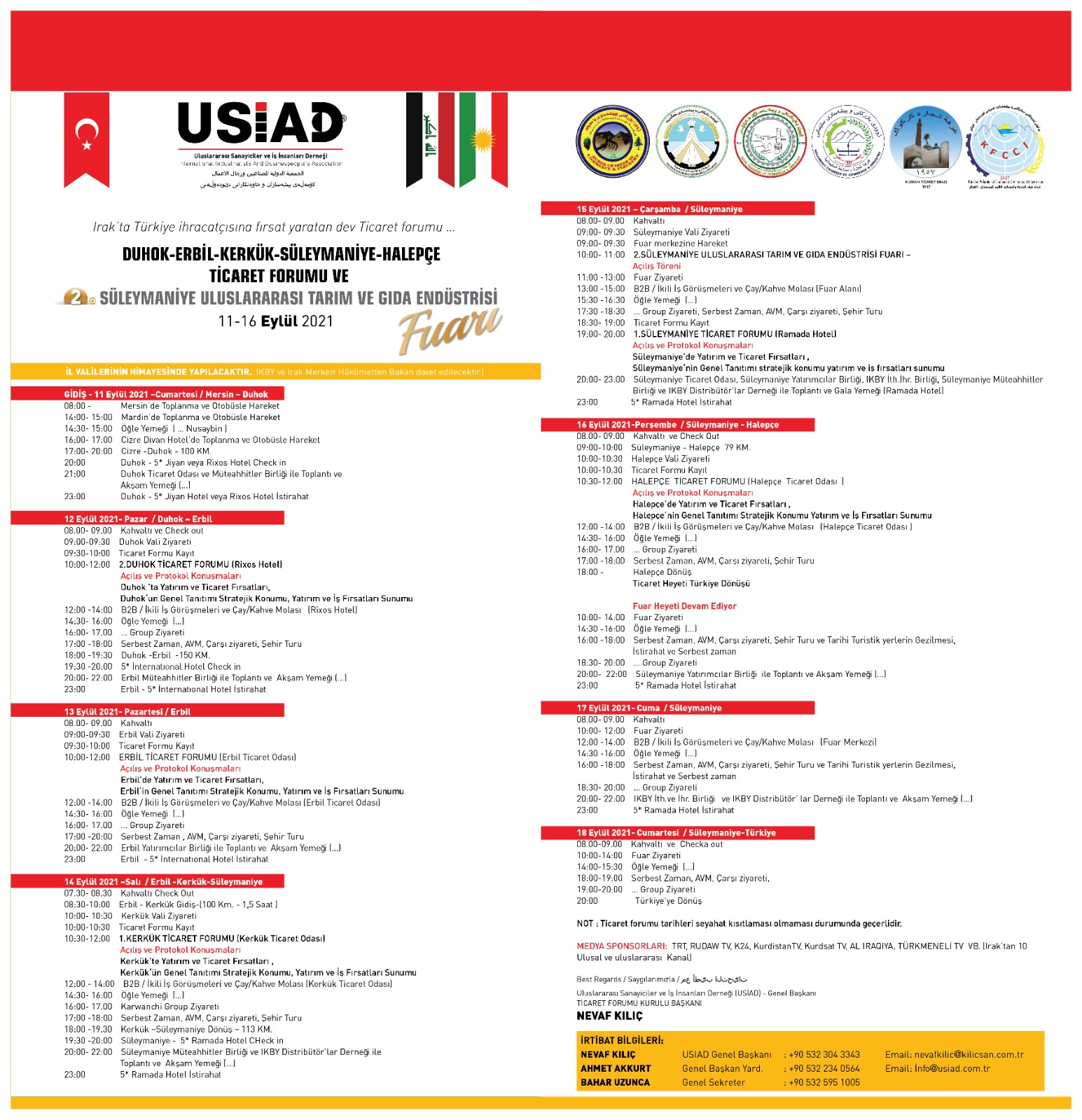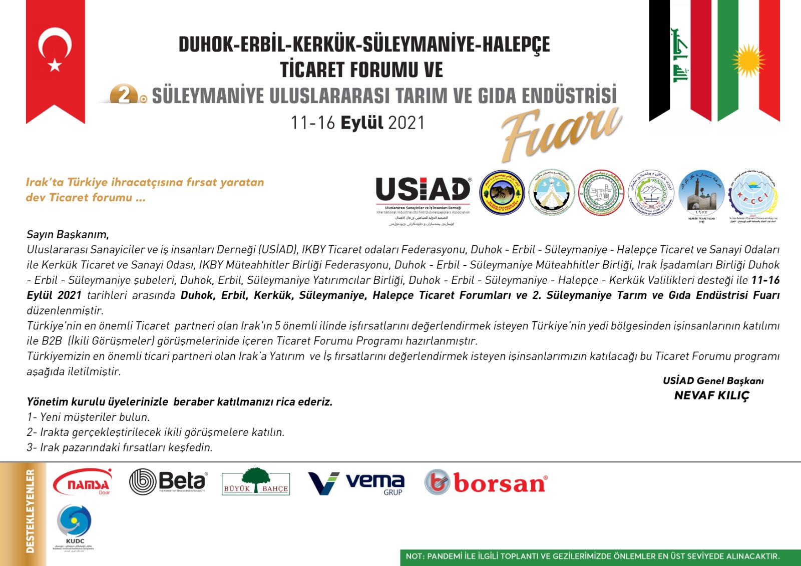 Ulusal Sanayici ve İş Adamları Derneği’nden (USİAD) gelen bir elektronik iletide, 11-16 Eylül 2021 tarihleri arasında Irak/Duhok-Erbil-Kerkük-Süleymaniye-Halepçe Ticaret Forumu ve 2.Süleymaniye Uluslararası Tarım ve Gıda Endüstrisi Fuarı düzenleneceği bildirilmektedir.
